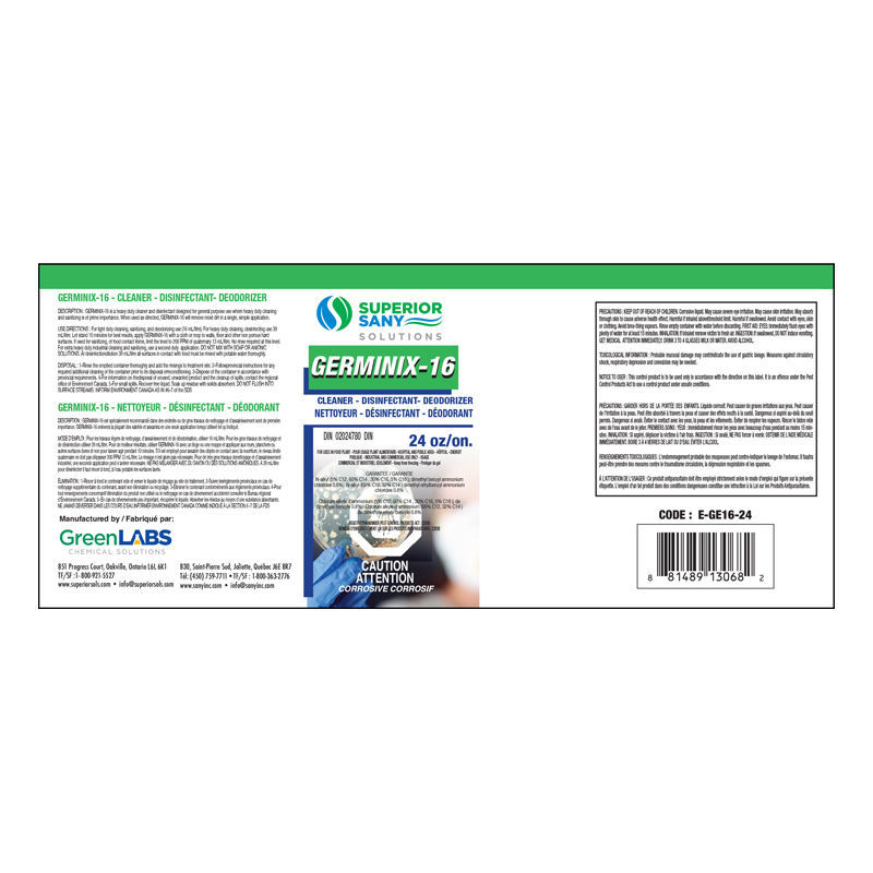 GERMINIX-16 est un détergent dégraissant désodorisant et désinfectant à base de quaternaire double. Il est utilisé pour nettoyer, désinfecter et désodoriser en une seule opération. Homologué à l’Agence canadienne d’inspection des aliments. ACIA. #DIN 02024780