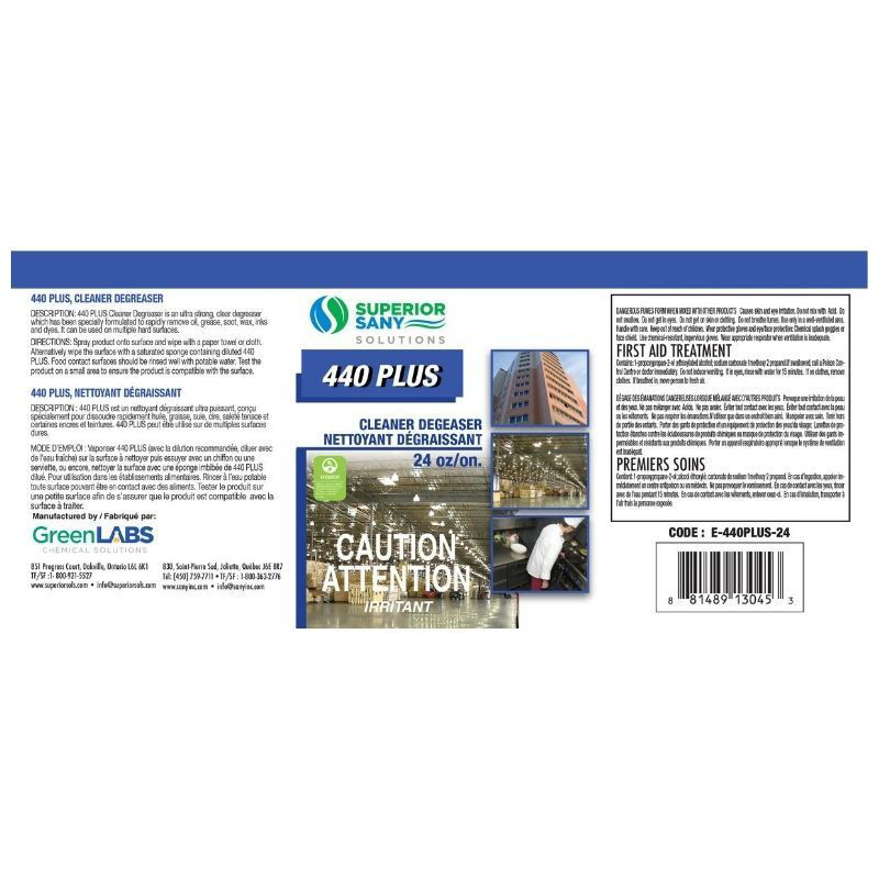 440 PLUS Nettoyant dégraissant ultra puissant, conçu spécialement pour dissoudre rapidement huile, graisse, suie, cire, saleté tenace et certaines encres et teintures. 440 PLUS peut être utilisé sur de multiples surfaces dures. Ce produit est certifié ÉcoLogo. Homologué à l’Agence canadienne d’inspection des aliments. ACIA. (UL 2759 - Norme 2011 pour la durabilité des nettoyants pour surfaces dures)