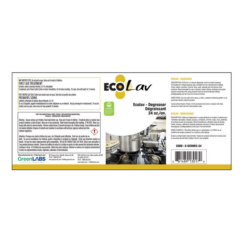 ECODEC nettoyant dégraisseur Ecolav à usage général et multiple. Excellent pour l’entretien des tables, chaises, bureaux, comptoirs, chrome, tuiles, murs, plafonds et surfaces dures non poreuses. Le nettoyant dégraissant Ecolav est recommandé pour utilisation dans les écoles, hôtels, bureaux, édifices et endroits publiques soucieux d’utiliser des produits écologiques, biodégradables et sûrs pour l’environnement. Le dégraissant Ecolav est certifié «ÉcoLogo» et homologué à l’Agence canadienne d’inspection des aliments. (UL 2759 - Norme 2011 de durabilité pour les nettoyants de surfaces dures)