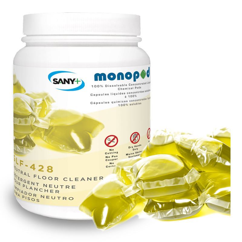 Capsule hydrosoluble, Monopod GLF-428 est un détergent neutre concentré pour planchers spécialement formulé pour le nettoyage des planchers durs dans les établissements commerciaux et industriels. Facile d'utilisation : ajouter une capsule de produit nettoyant à de l'eau dans un seau ou un équipement à plancher, dissoudre et utiliser selon les directives. Le détergent neutre concentré pour plancher dissout rapidement les huiles, la graisse et d’autres salissures qui s’accumulent sur les surfaces des planchers. Certifié par Green Seal et l'Agence Canadienne de l'inspection des aliments. Doux parfum de lavande.