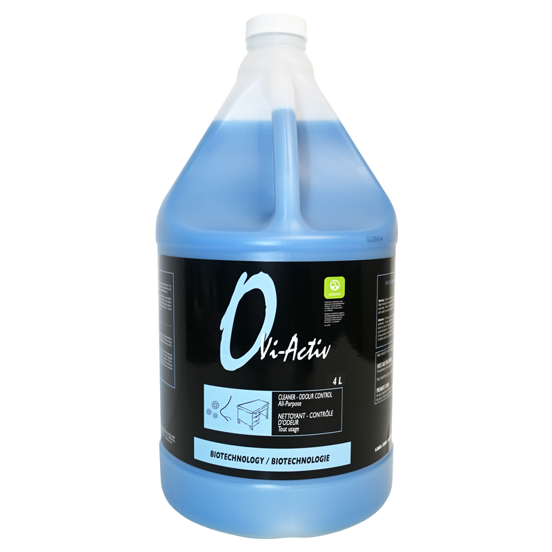 Éliminateur d’odeur biologique. OVI-ACTIV agit de façon continue sur les mauvaises odeurs. De plus, le produit est très efficace pour les odeurs telles que celles d’urine et de matières fécales. Il laisse une odeur fraîche et propre. Celui-ci peut être inefficace en présence de désinfectants chimiques tels que le formaldéhyde ou le chlore, et doit être utilisé sur une base continue afin d'assurer l'efficacité. Certifié Écologo. (UL 2792 - Norme 2012 de durabilité pour les composés de nettoyage et de dégraissage : à base biologique)